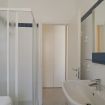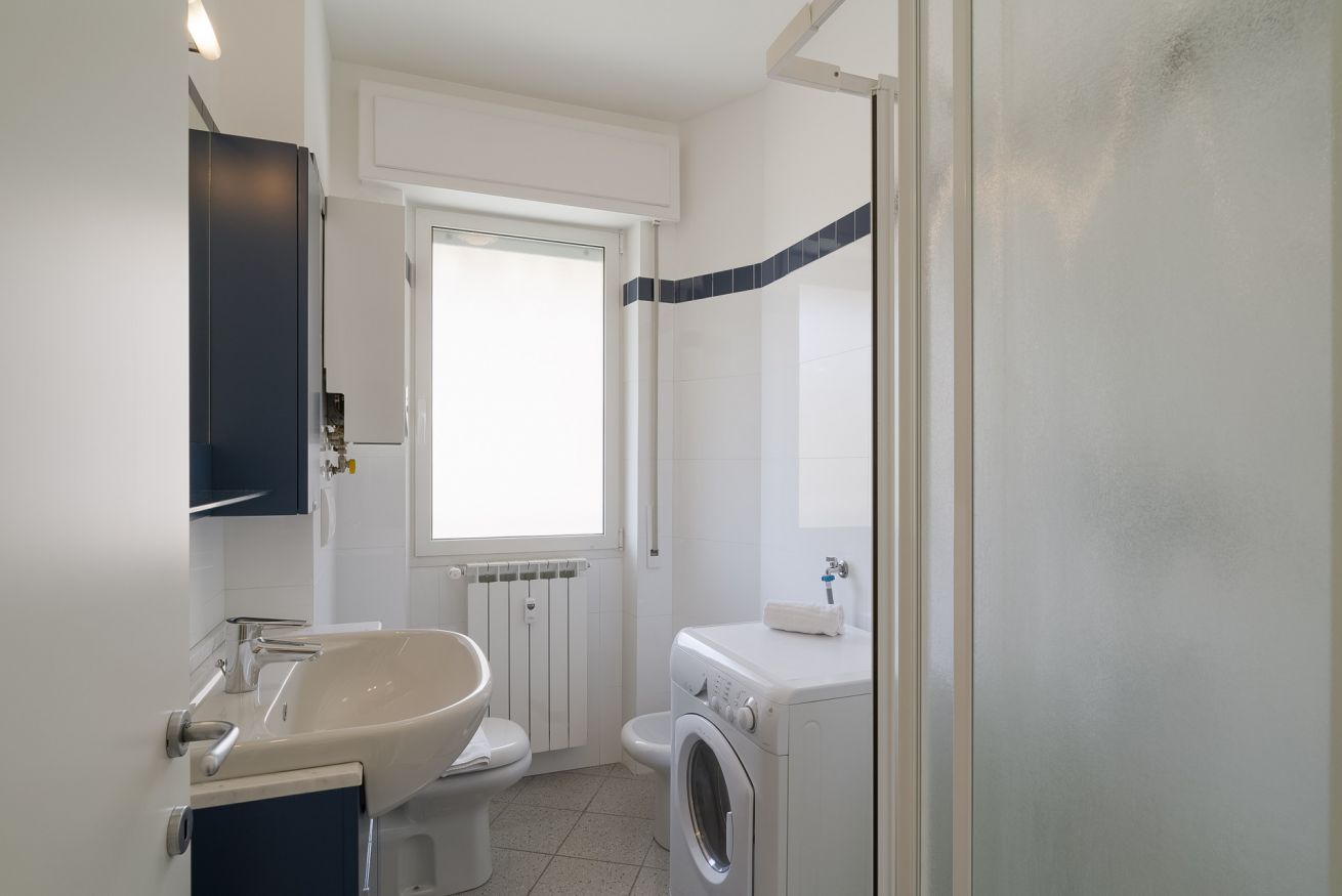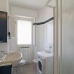 Il bagno, comodo e moderno, è dotato di doccia e lavatrice.