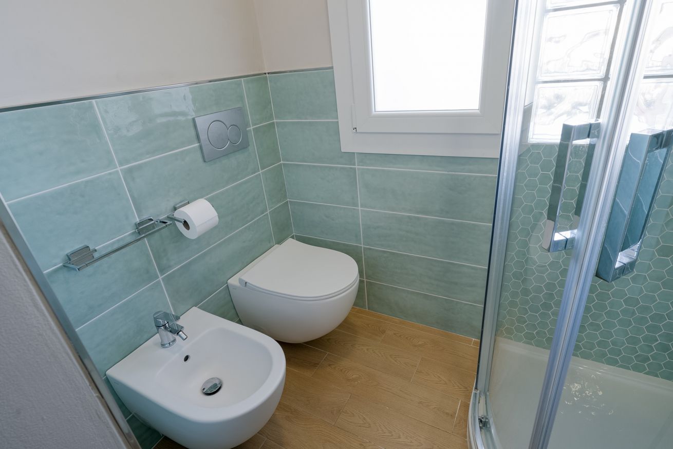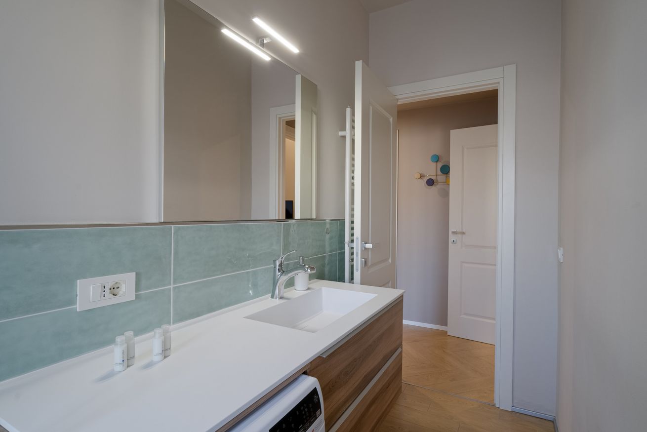 Il bagno, completamente rinnovato, è elegante e moderno, con una doccia comoda e piastrelle di alta qualità. Qui troverete anche una lavatrice per poter fare il bucato comodamente durante la vostra permanenza.