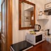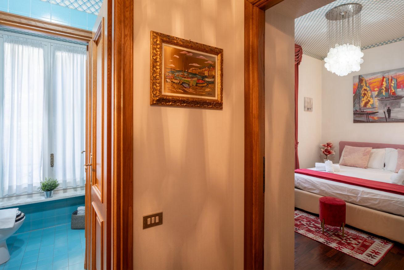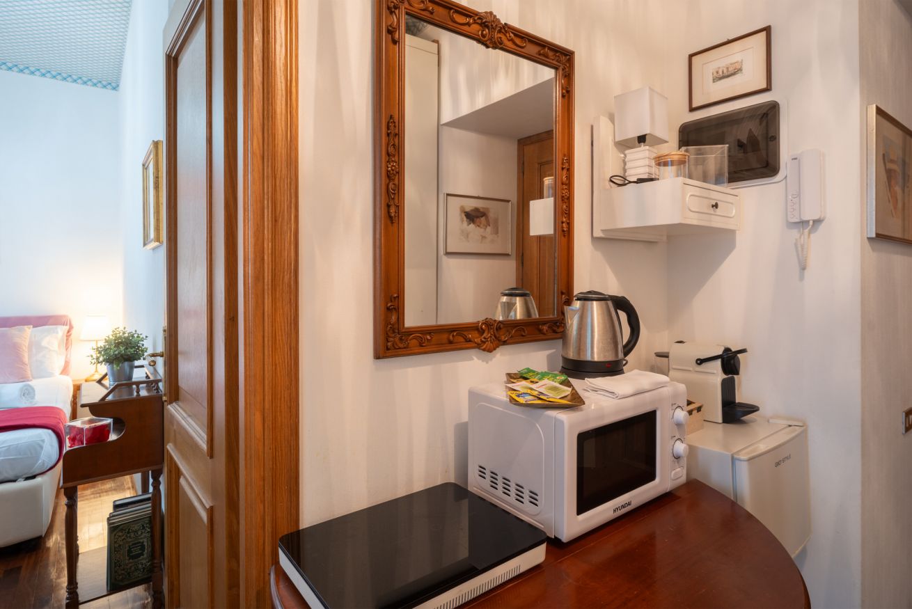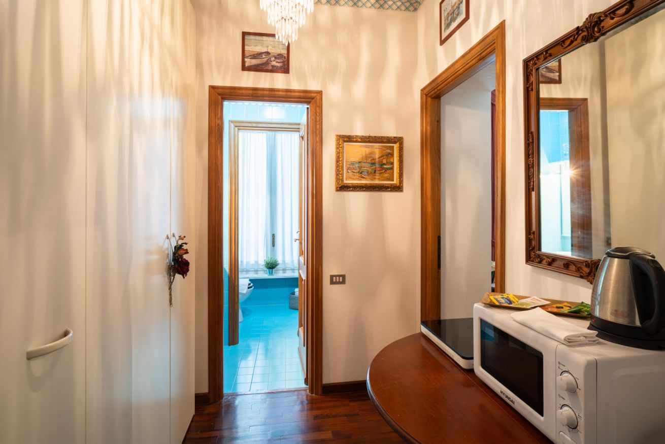 L’alloggio dispone di una spaziosa camera da letto matrimoniale, un comodo bagno con ampia doccia e un pratico angolo attrezzato (non è presente la cucina) con microonde, piastra elettrica, bollitore, macchina del caffè e un piccolo frigorifero — l’essenziale per una colazione o un pasto veloce.