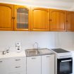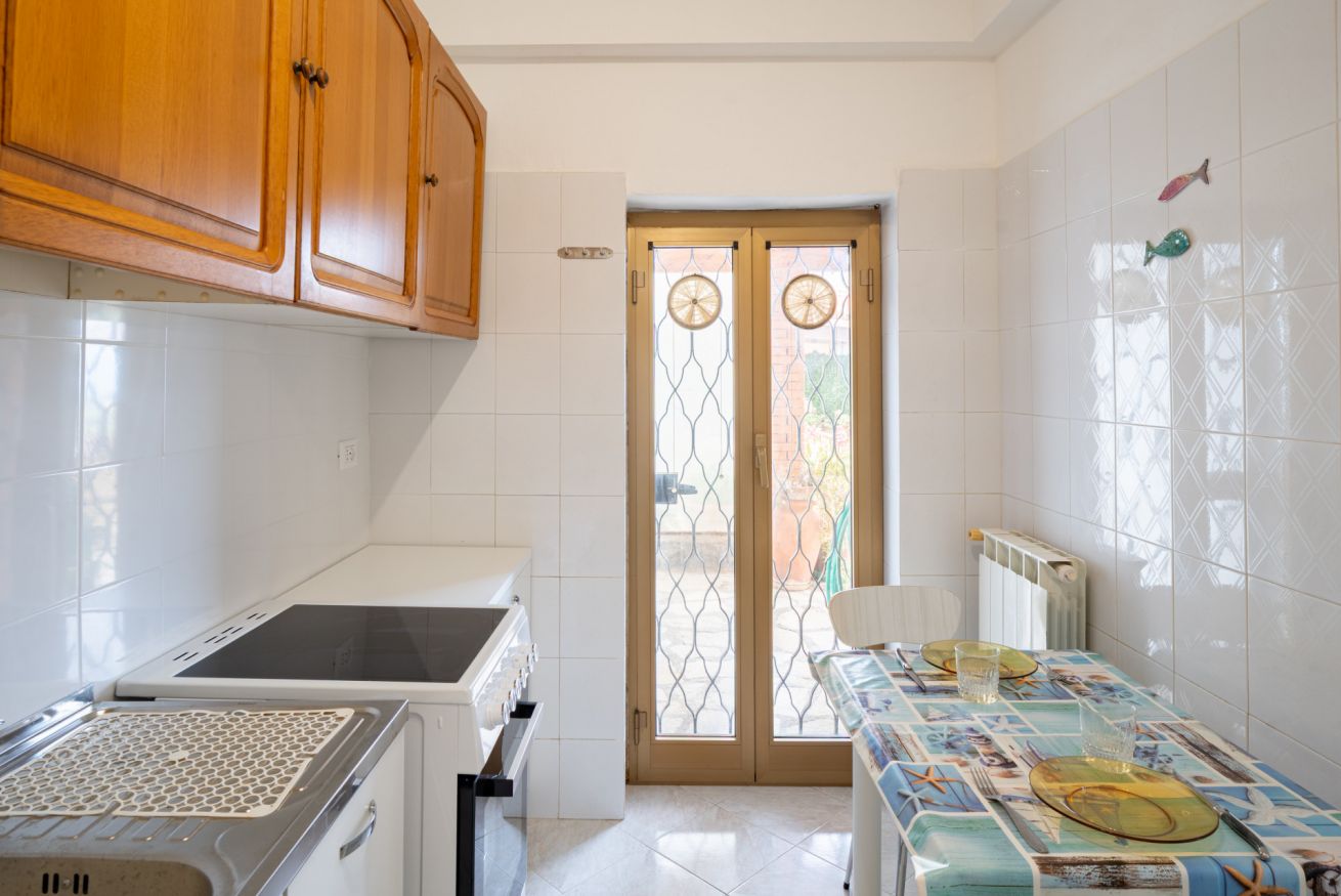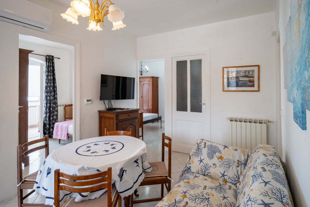 La zona giorno è composta da una luminosa sala con divano e angolo pranzo, perfetta per rilassarsi dopo una giornata al mare o di escursioni. La cucina è abitabile e completamente attrezzata, con tavolo da pranzo e tutto il necessario per cucinare come a casa.