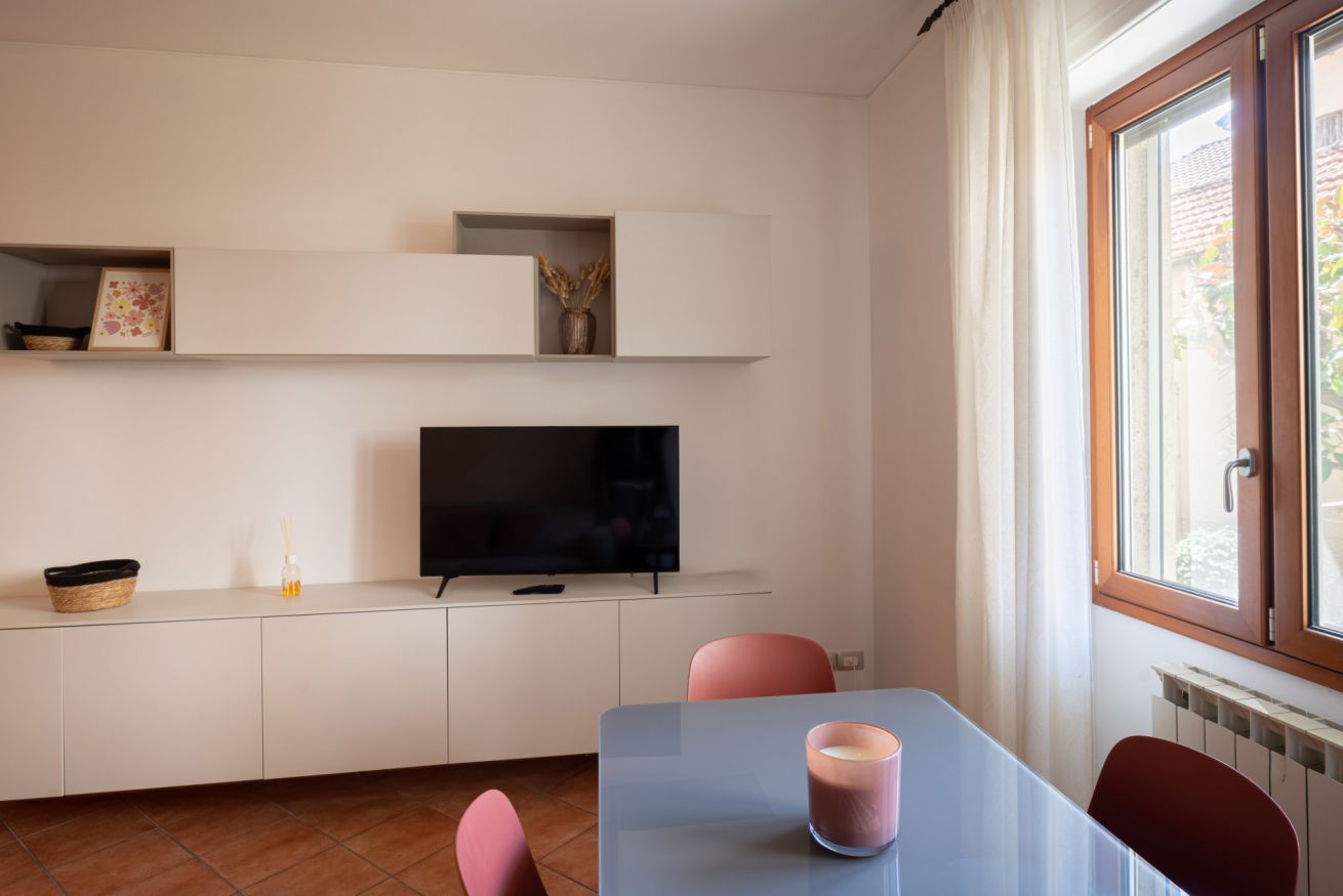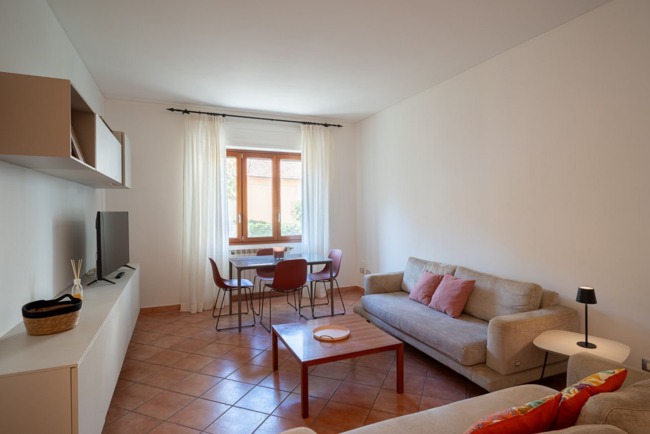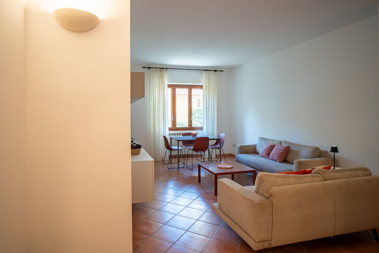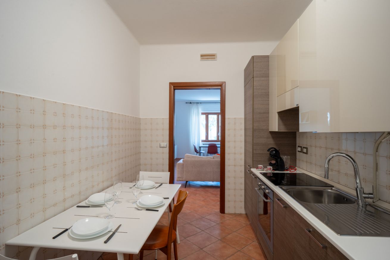 La cucina abitabile è completamente attrezzata, mentre l’ampio soggiorno con due accoglienti divani e una zona pranzo è perfetto per condividere momenti in compagnia.