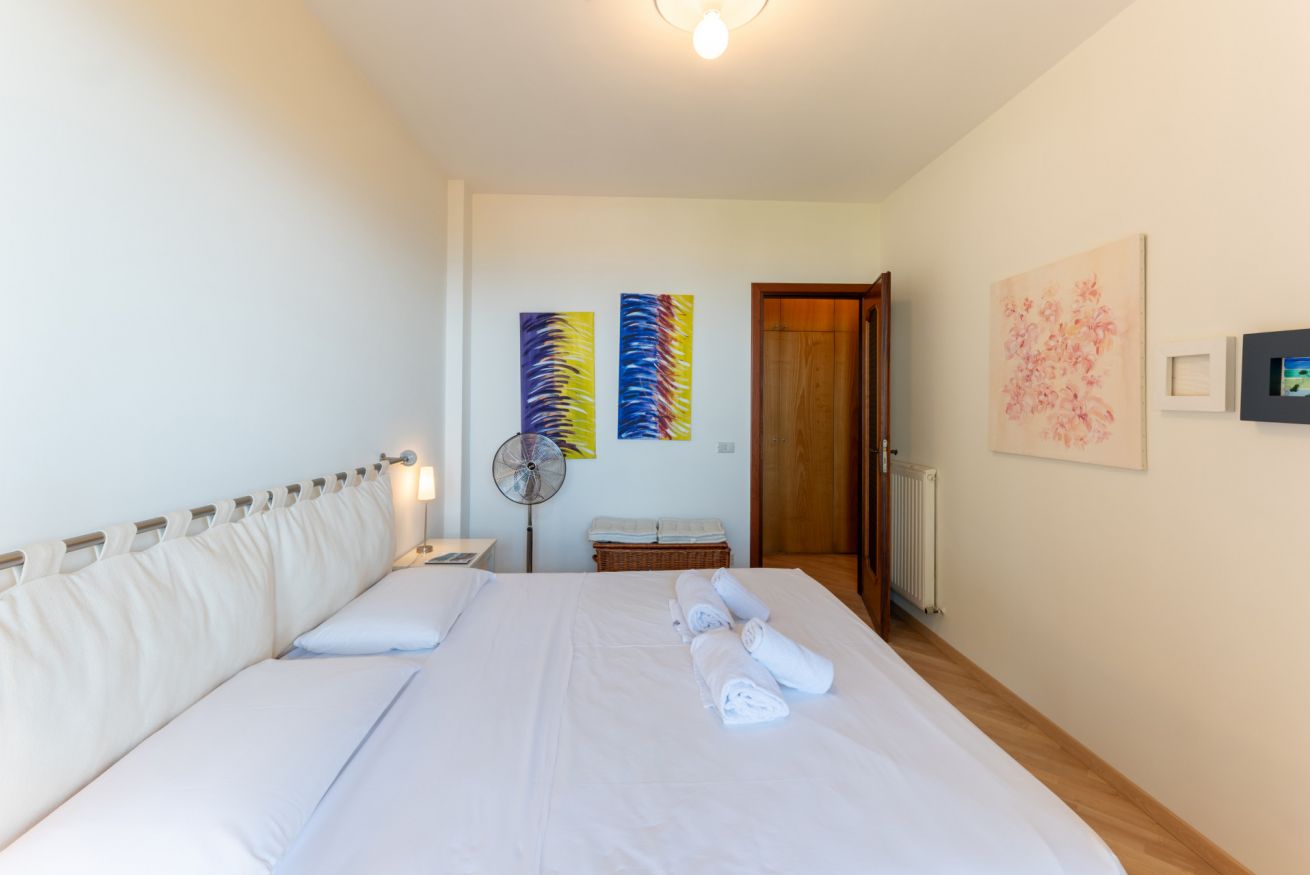 La camera matrimoniale è accogliente, luminosa e spaziosa, con accesso diretto al terrazzo e una splendida vista sul mare, ideale per svegliarsi ogni mattina con una sensazione di pace e bellezza. Il bagno, moderno e funzionale, è dotato di box doccia.