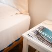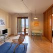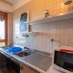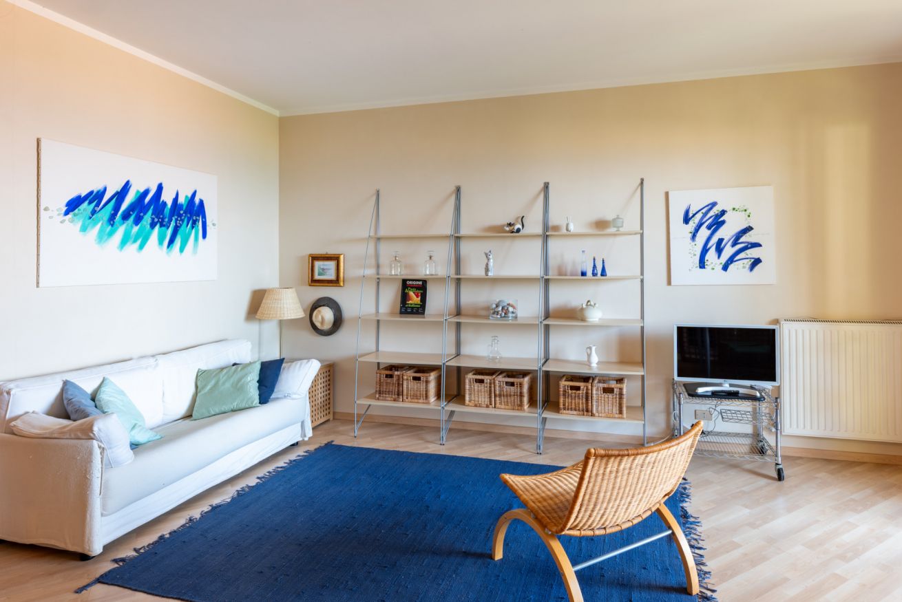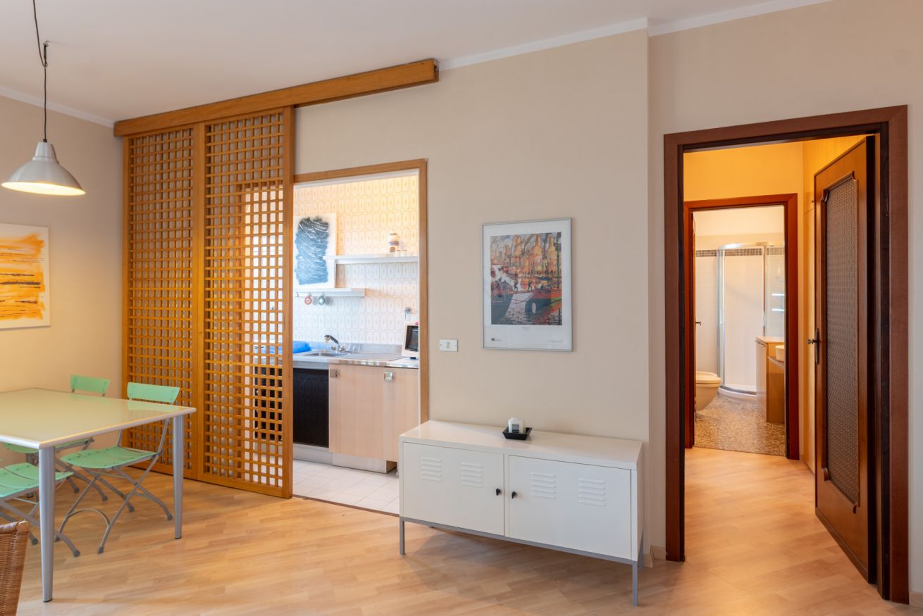La zona giorno è ampia e ben distribuita: offre una zona pranzo, un angolo con divano e TV ideale per rilassarsi dopo una giornata al mare, e un angolo cottura separato e attrezzato con tutto il necessario per cucinare in autonomia. Il divano può essere facilmente trasformato in un comodo letto, permettendo all’appartamento di ospitare fino a 3 persone senza rinunciare al comfort.