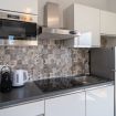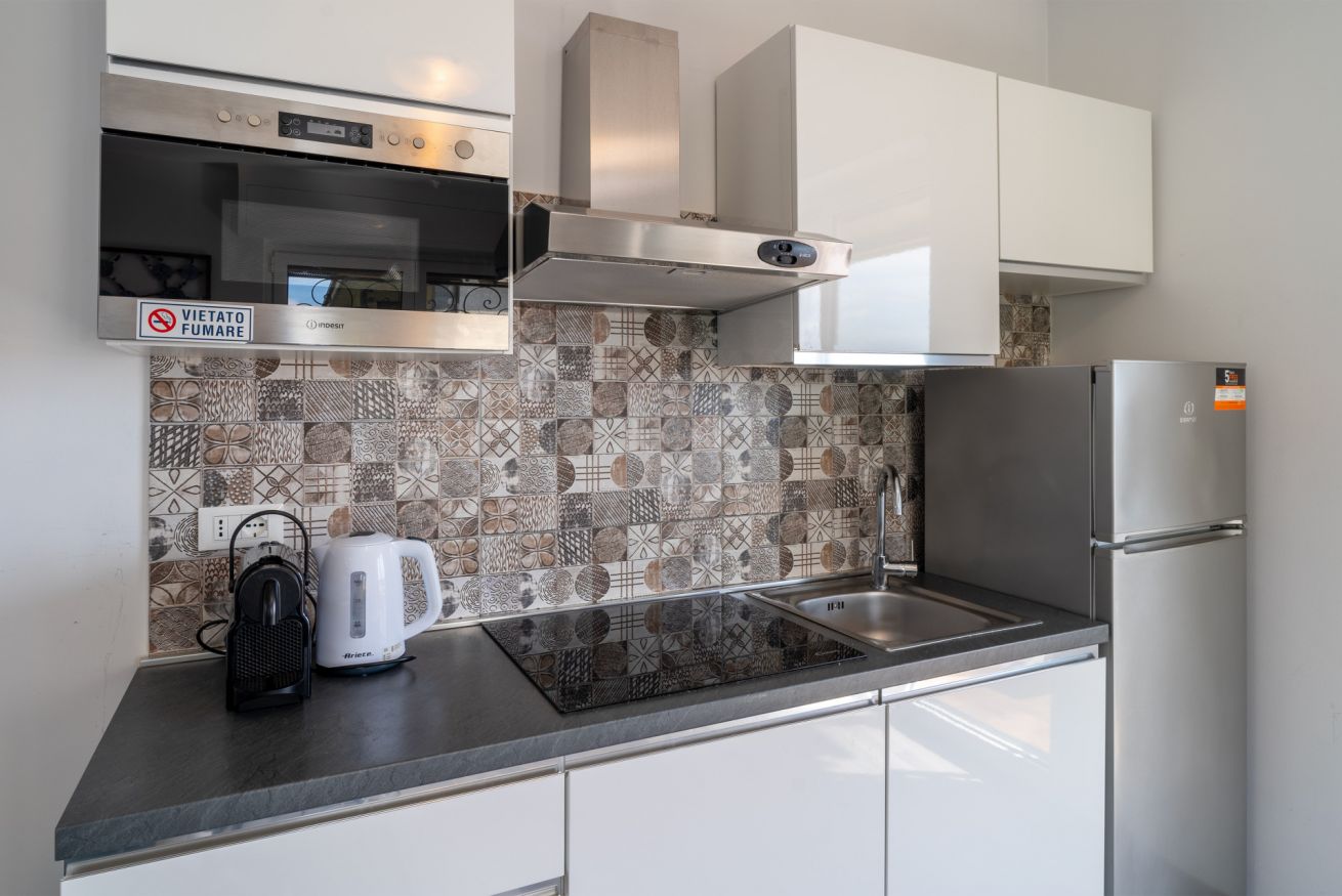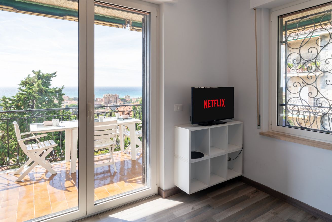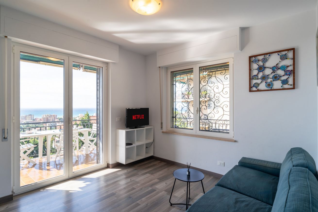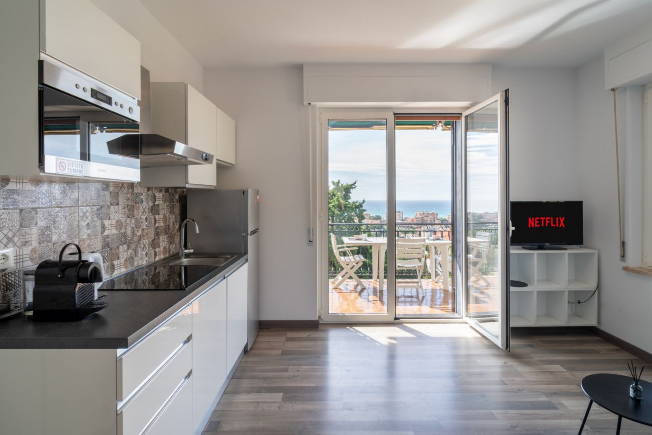 Incantevole trilocale, piscina condominiale (aperta nei mesi di luglio e agosto), terrazza con superba vista mare in prestigioso contesto residenziale con 2 camere da letto, 1 bagno, soggiorno con cucina a vista.