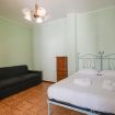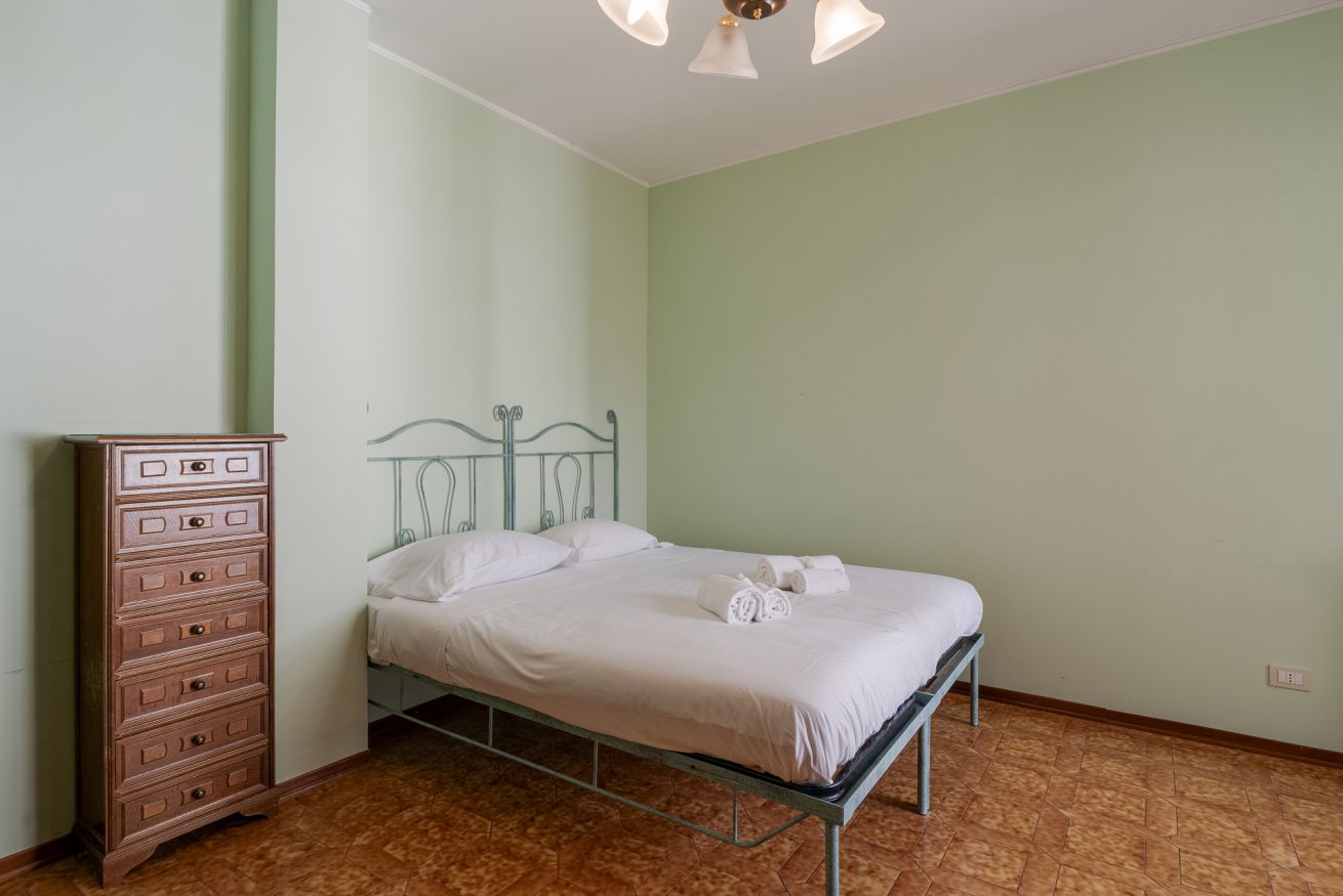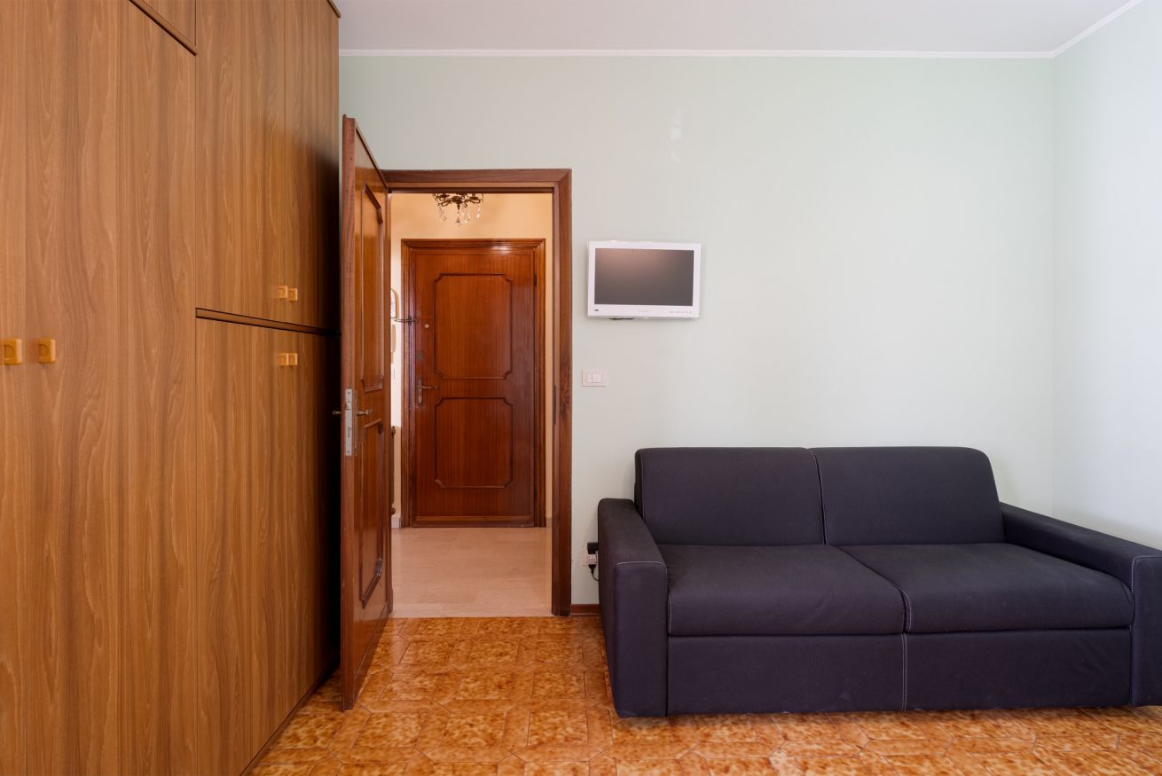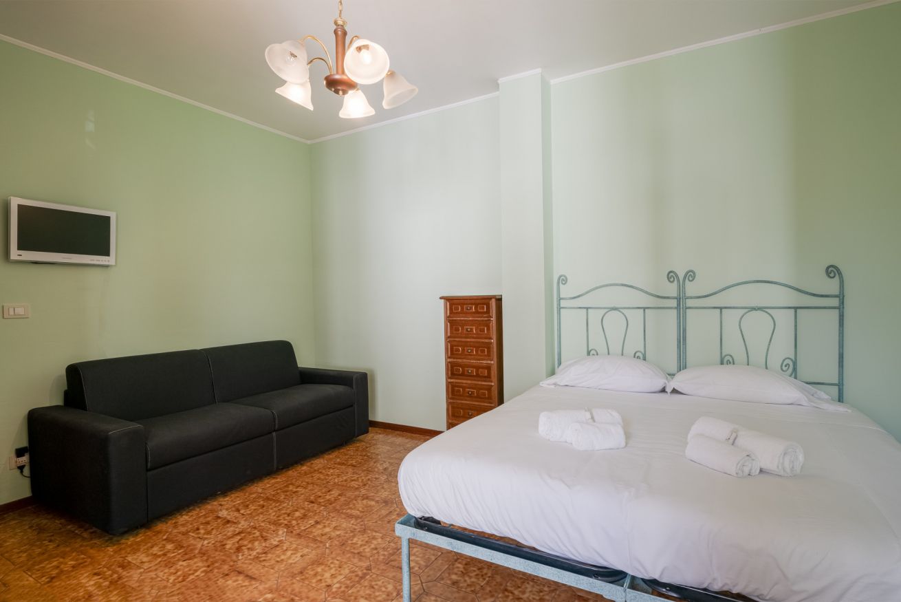 -Ampio ambiente con un letto matrimoniale ed un divano letto, grande armadiatura, tavolo con sedie e tv.