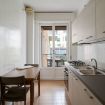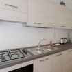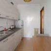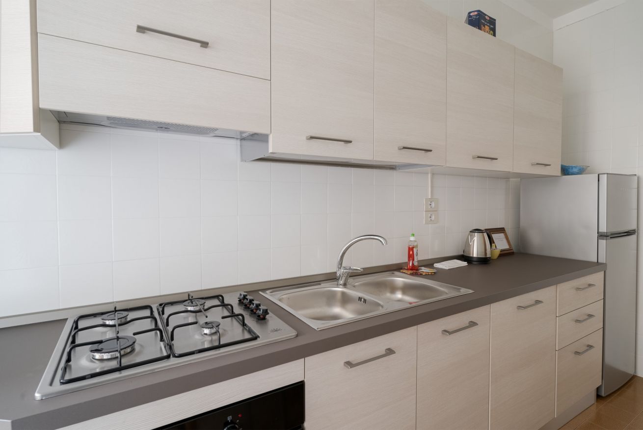 -Cucina attrezzata con fornelli, frigorifero, forno e lavatrice, bollitore, tavolo con sedie.