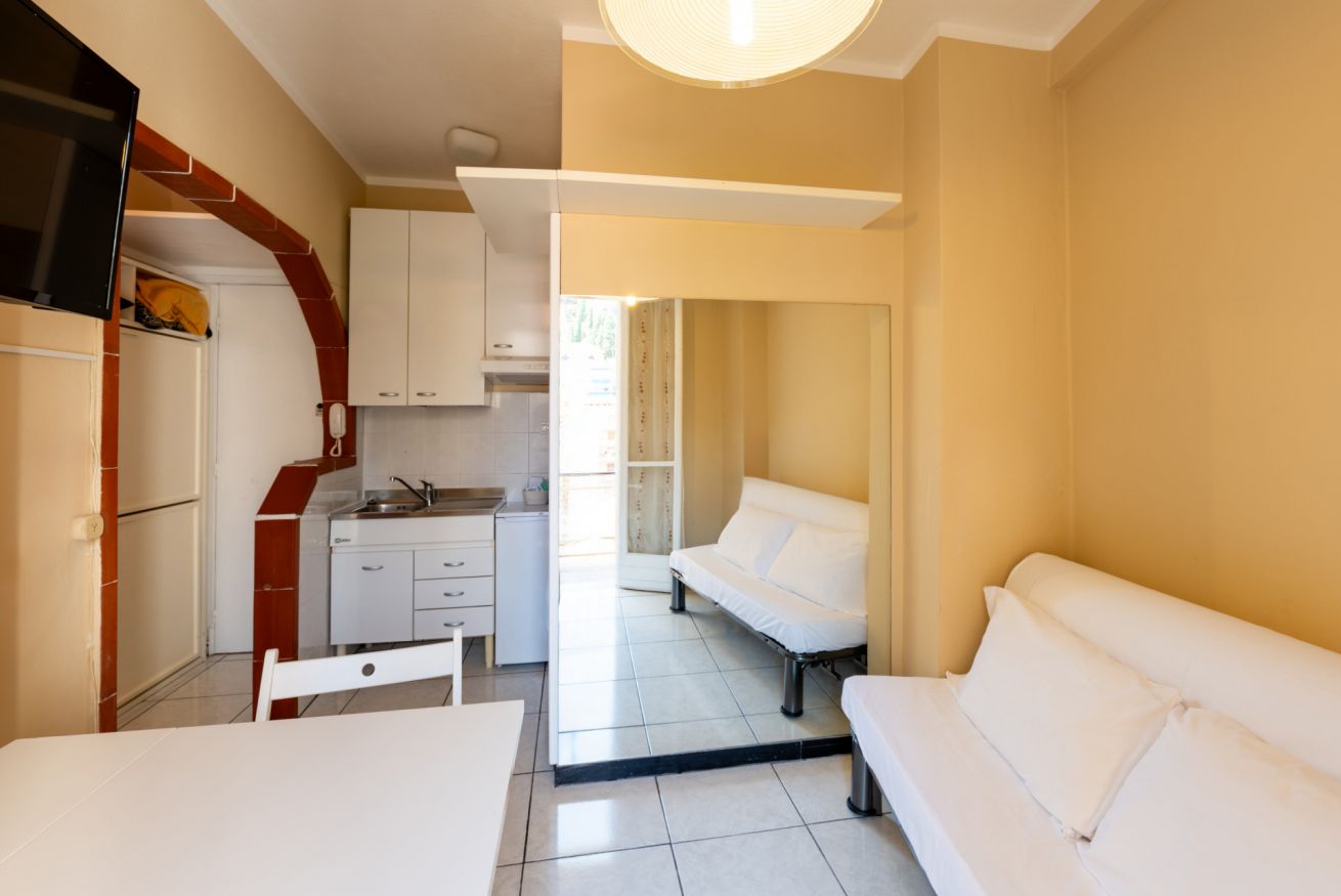 L’alloggio offre un pratico angolo cottura con piastra elettrica, piccolo frigorifero e lavabo, un divano letto matrimoniale e un bagno compatto con doccia.