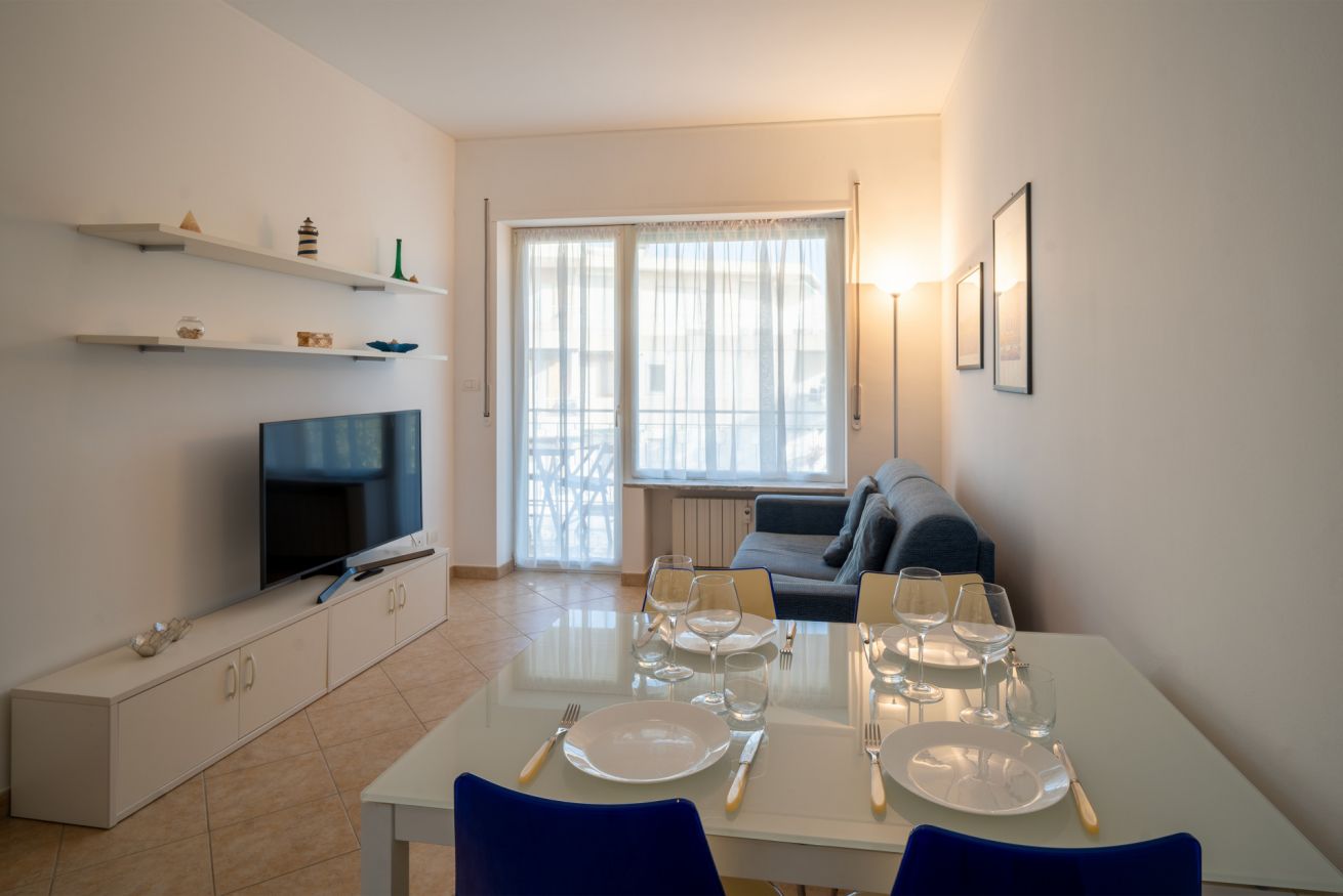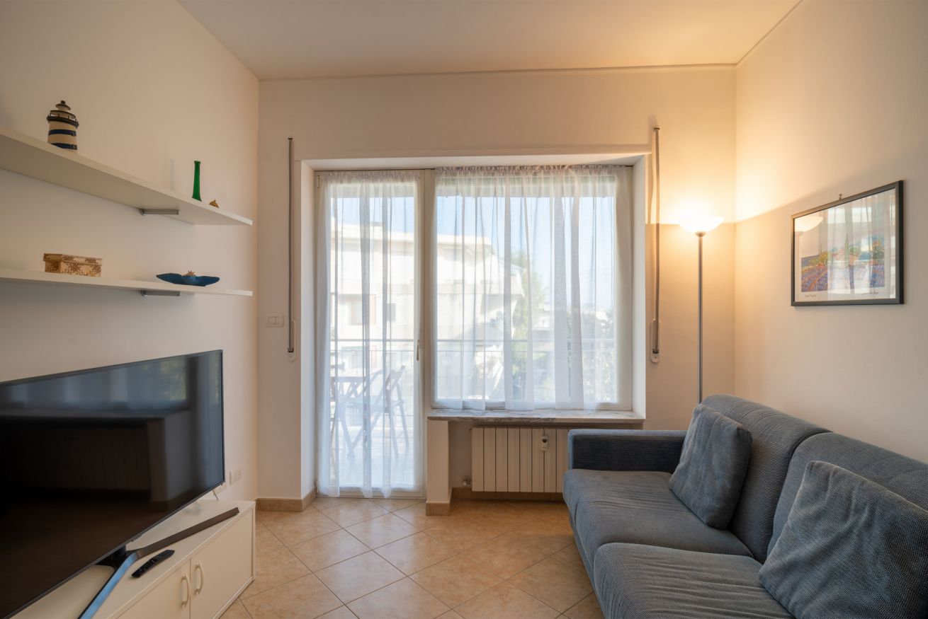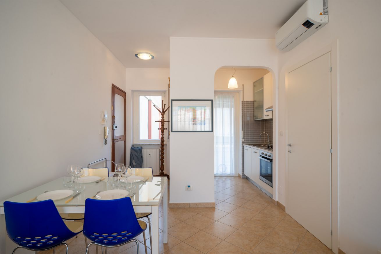 A completare l’appartamento troviamo un bagno con vasca, utilizzabile anche come doccia, e un grazioso terrazzo dotato di tavolo da pranzo, dal quale si può godere di un piacevole scorcio di mare.