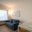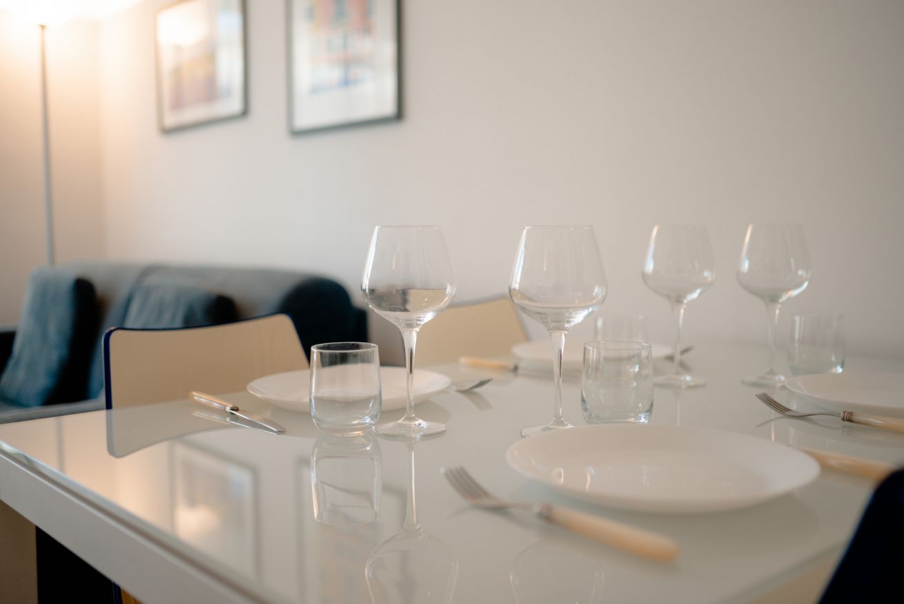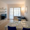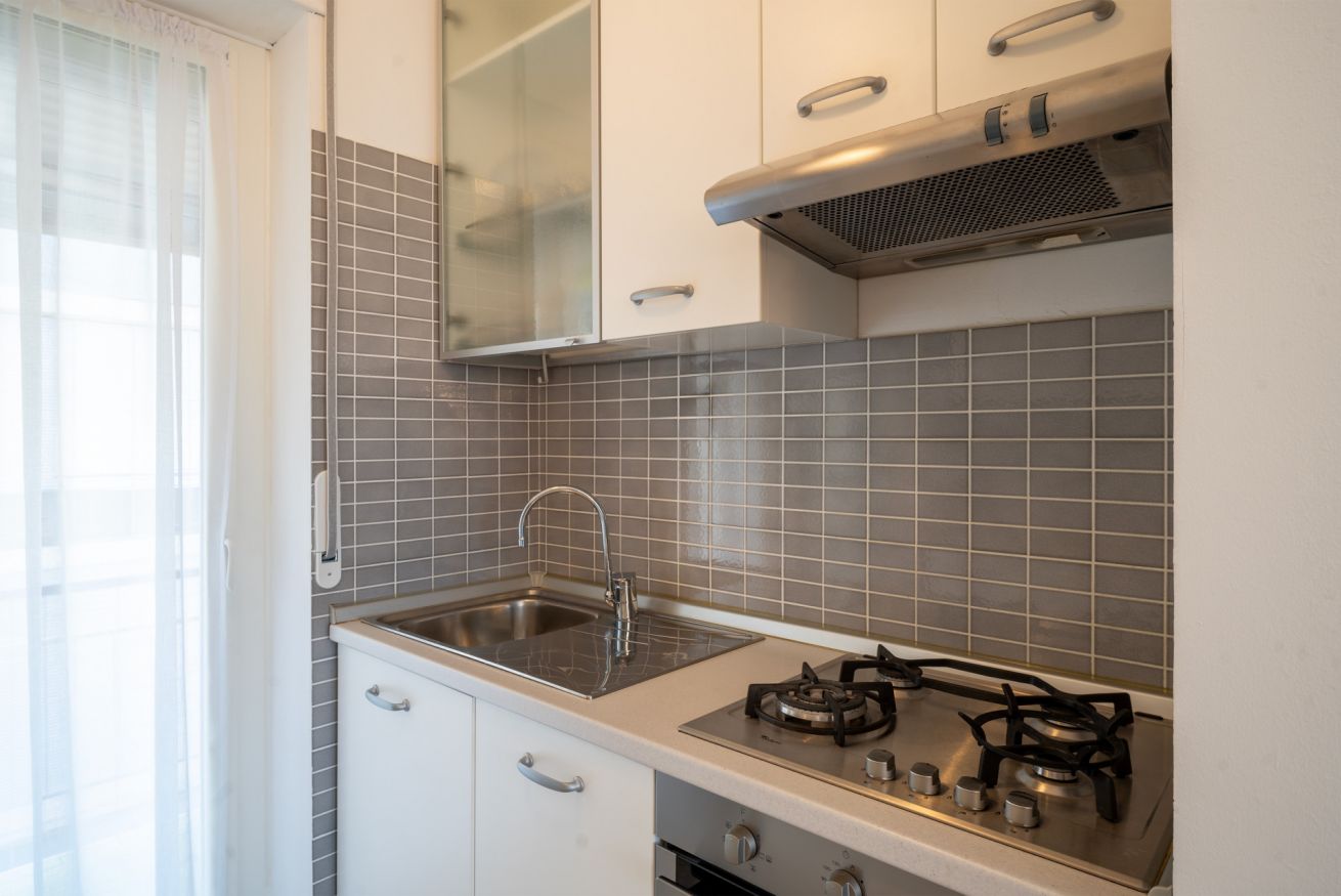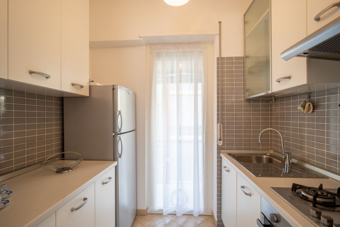 L’ampia zona giorno è composta da un’area relax con comodo divano e TV e da una zona pranzo con un tavolo che può ospitare fino a quattro persone. Attraverso un elegante arco si accede alla cucina, separata ma comunicante con la zona giorno, completamente attrezzata con fornelli, forno, frigorifero e freezer.
