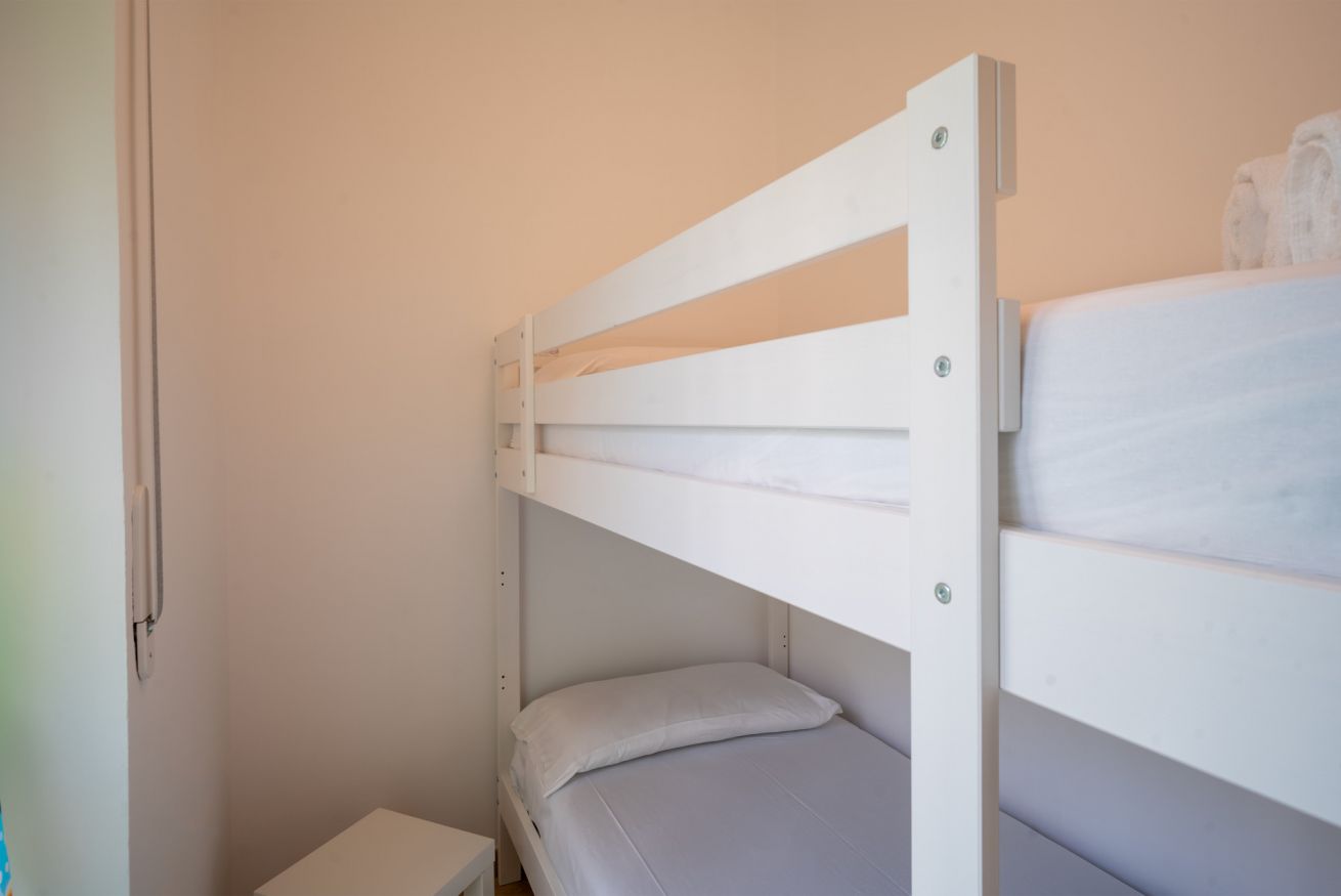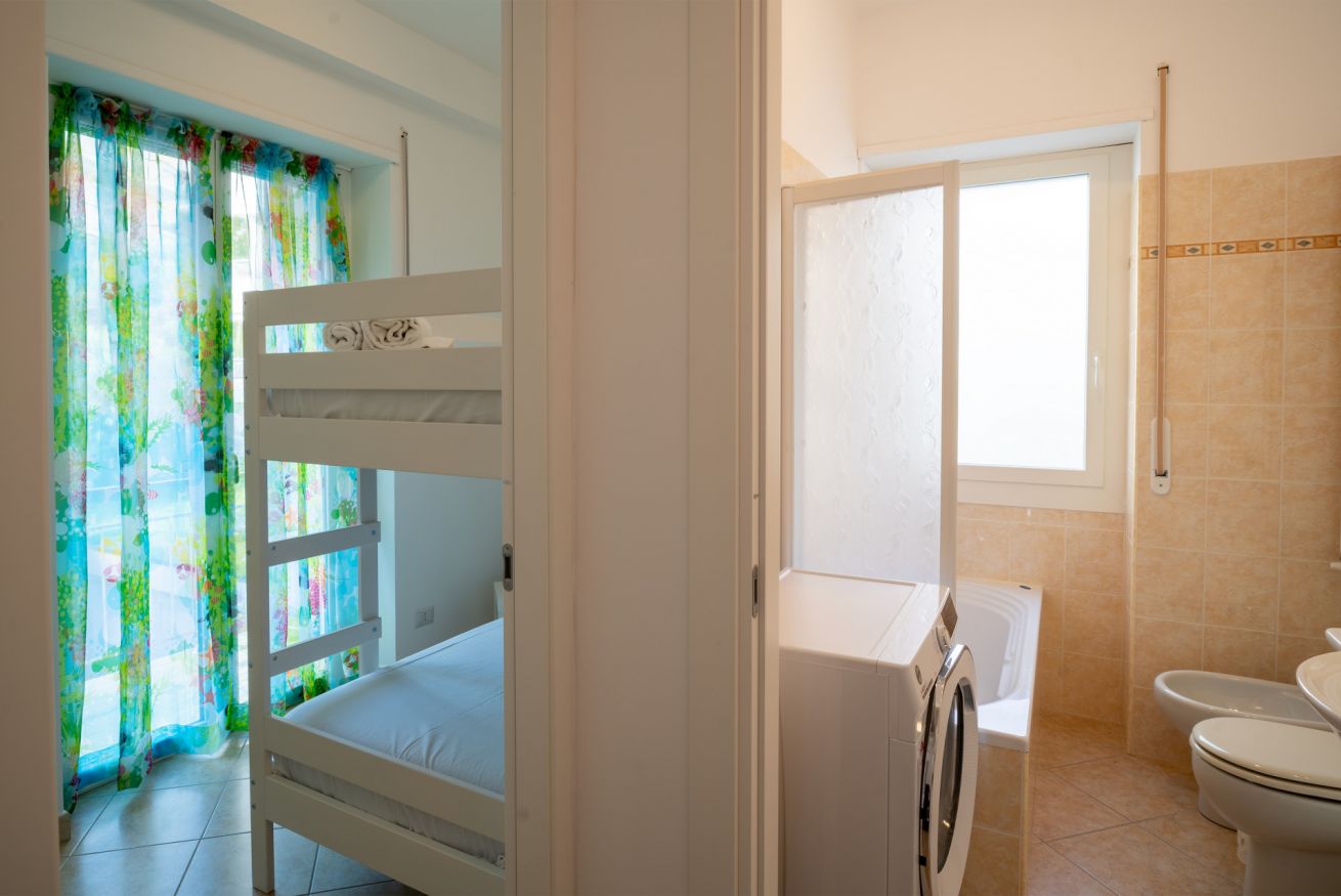 La zona notte comprende due camere da letto: una camera matrimoniale e una seconda camera con letto a castello, rendendo l’alloggio perfetto per ospitare comodamente fino a quattro persone, ideale per famiglie.